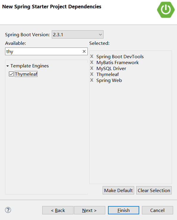 在输入框中依次输入以下五个选项,并选中,会在右侧出现你选中的选项,这些都会在后面的开发过程中用到,如果忘记添加也没关系,后续可以在项目的pom.xml中添加即可,项目的pom.xml是个依赖管理的配置文件